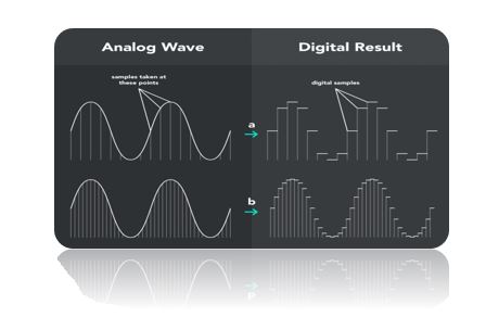 هنگام بررسی موج صدا، مشاهده میکنید که محور Y قدرت موج را نشان میدهد و محور X زمان را نشان میدهد. هر موج دارای یک اوج و دره است و همچنین هر صدا دارای فرکانس خاصی است. هرچه فرکانس بالاتر باشد، نت بالاتر است. در سمت راست تصویر زیر، سیگنال دیجیتال و در سمت چپ سیگنال آنالوگ را مشاهده میکنید.