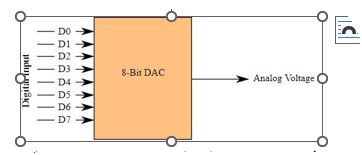 مدار تبدیل سیگنال دیجیتال به آنالوگ از تعدادی ورودی باینری و یک خروجی آنالوگ تشکیل شده است. تعداد ورودیهای باینری معمولاً توان عدد دو بوده و این مدار قادر است سیگنالهای نمونهبرداری شده را با دقت بالا به سیگنالهای آنالوگ تبدیل کند.