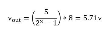 فرض کنید یک DAC 3 بیتی داریم که مرجع ولتاژ آن 8 ولت است. در این صورت، مقدار خروجی برای ورودی باینری 101 (عدد ۵ در مبنای ده) برابر خواهد بود با