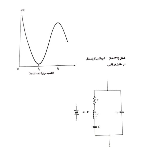 كريستال كه مدار الكتريك معادل آن در شكل (١٨-٣١) نشان داده شد، داراى دو فركانس تشديد است. يكى از شرايط تشديد وقتى اتفاق مى افتدكه راكتانس سرى دو شاخه RLC مساوى (و مخالف) باشند. دراين حالت اميدانس سرى تشديد خيلى كوجك (و برابر R) است. حالت ديكَر رزونانس زمانى اتفاق مى افتدكه راكتانس شاخه سرى تشديد با راكتانس خازن CM برابر باشد. اين حالت مربوط به رزونانس موازى يا وضعيت بى تشديدى كريستال است. دراين فركانس، كريستال اميدانس بسيار زيادى در خروجى بدست مى دهد. منحنى مربوط به اميدانس در برابر فركانس كريستال در شكل (١٨-٣٣) نشان داده شده است. بمنظور استفاده صحيح ازكريستال، اين قطعه بايستى بكونه اى به مدار وصل شود كه اميدانس كم در حالت كارتشديد سرى و يا اميدانس زياد در حالت كار بى تشديد مورد نظر باشد.